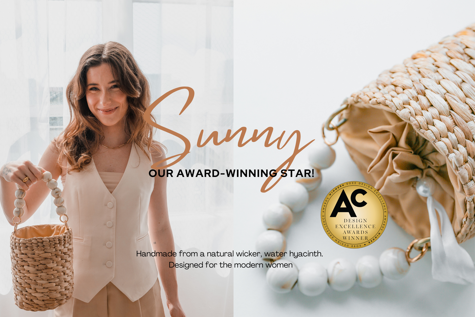Designed with practicality and sophisication in mind, 'Sunny' handle bag won this prestigious award in 2022 and it continues to be one of our best sellers! Handmade with love by our artisan partner in Indonesia, 'Sunny' is made from an eco-friendly and natural material called lwater hyacinth.